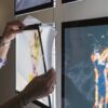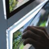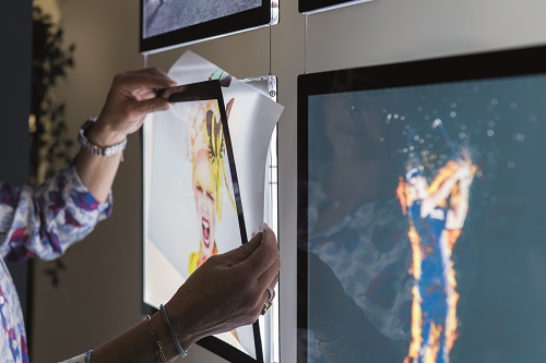 Beside giving a professional, streamlined look, this ingenious solution allows the height of the panels to be easily adjusted. This system allows double-sided displays: translucent paper can be inserted into the front and back of the LED panels.